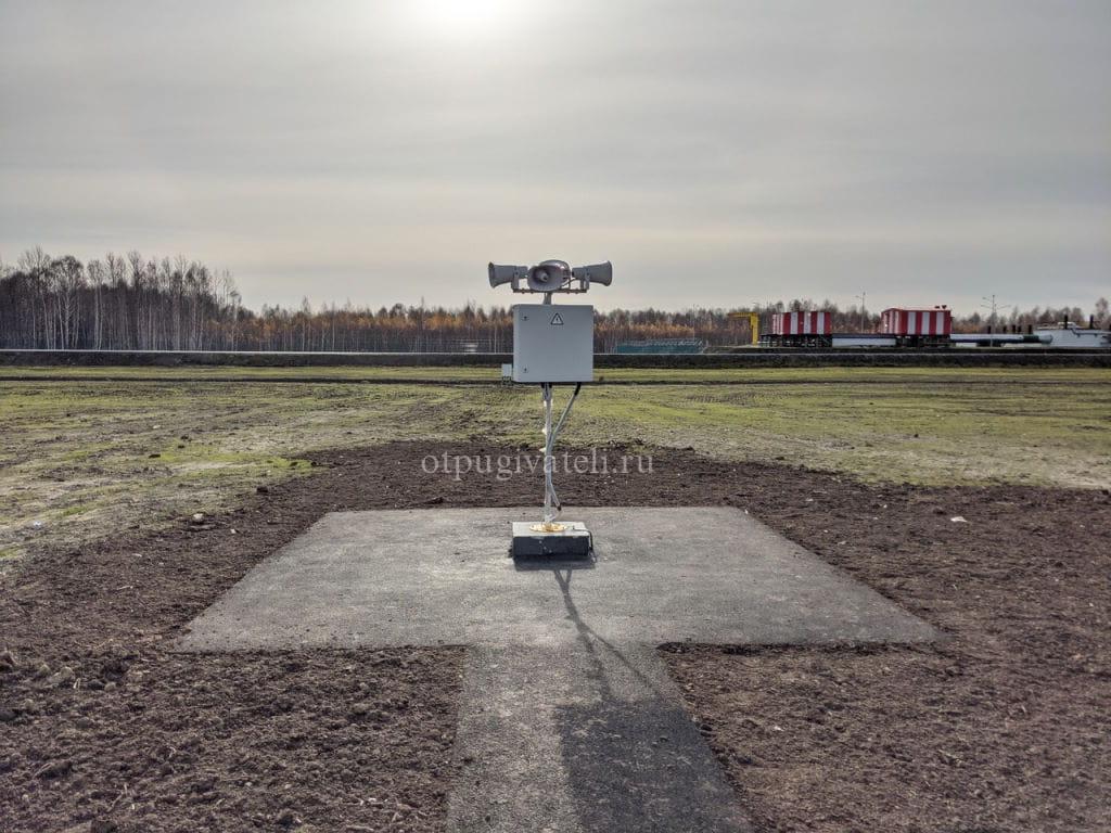 - аэродромы и вертодромы. Возможна установка вдоль ВПП из расчёта, что оптимальное расстояние между двумя приборами – 400 м в ключевых точках аэродрома (вертодрома) где наблюдается скопление птиц;